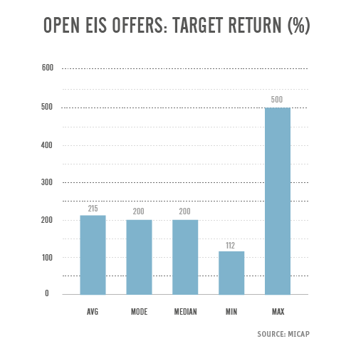 There are five open EIS offers that are targeting a return of 120% or lower (which is less than 10% of the market). However, with target returns this low, the question must be asked as to whether these strategies are truly growth capital focused. They may be working at the fringes of the rules.